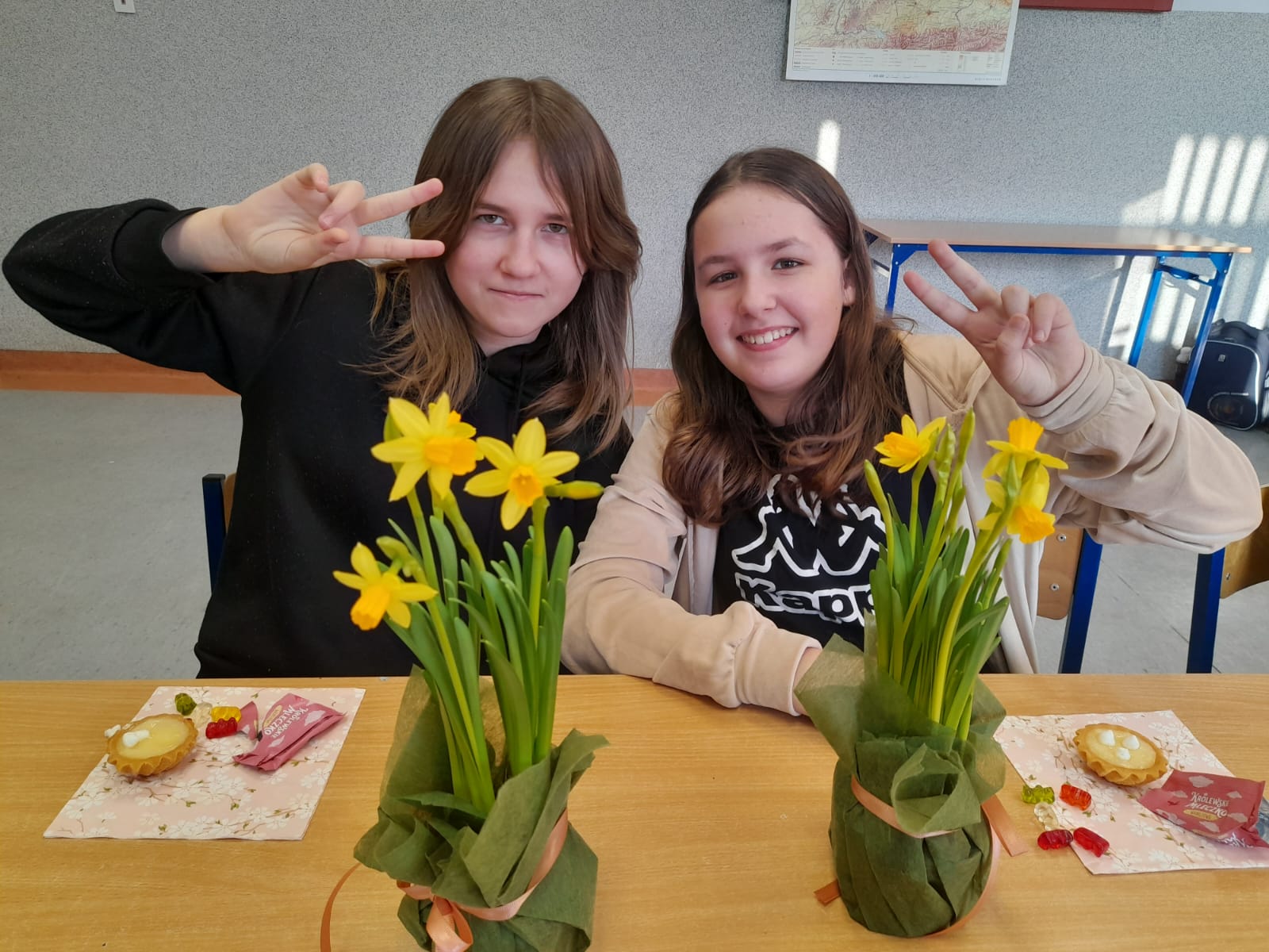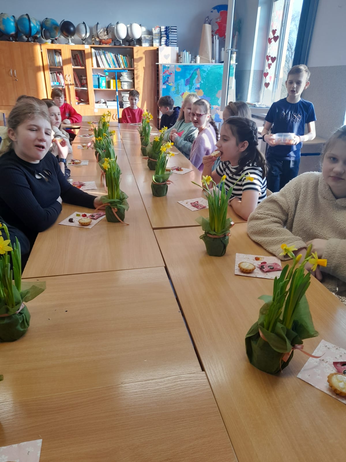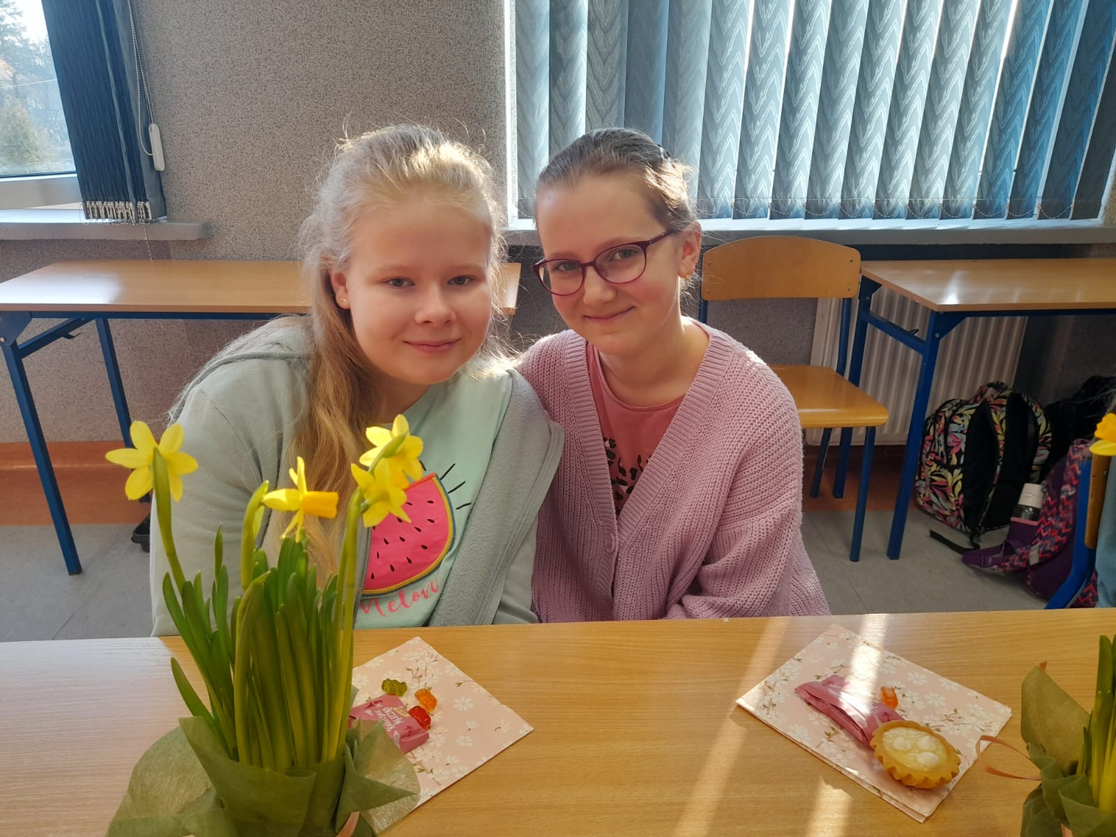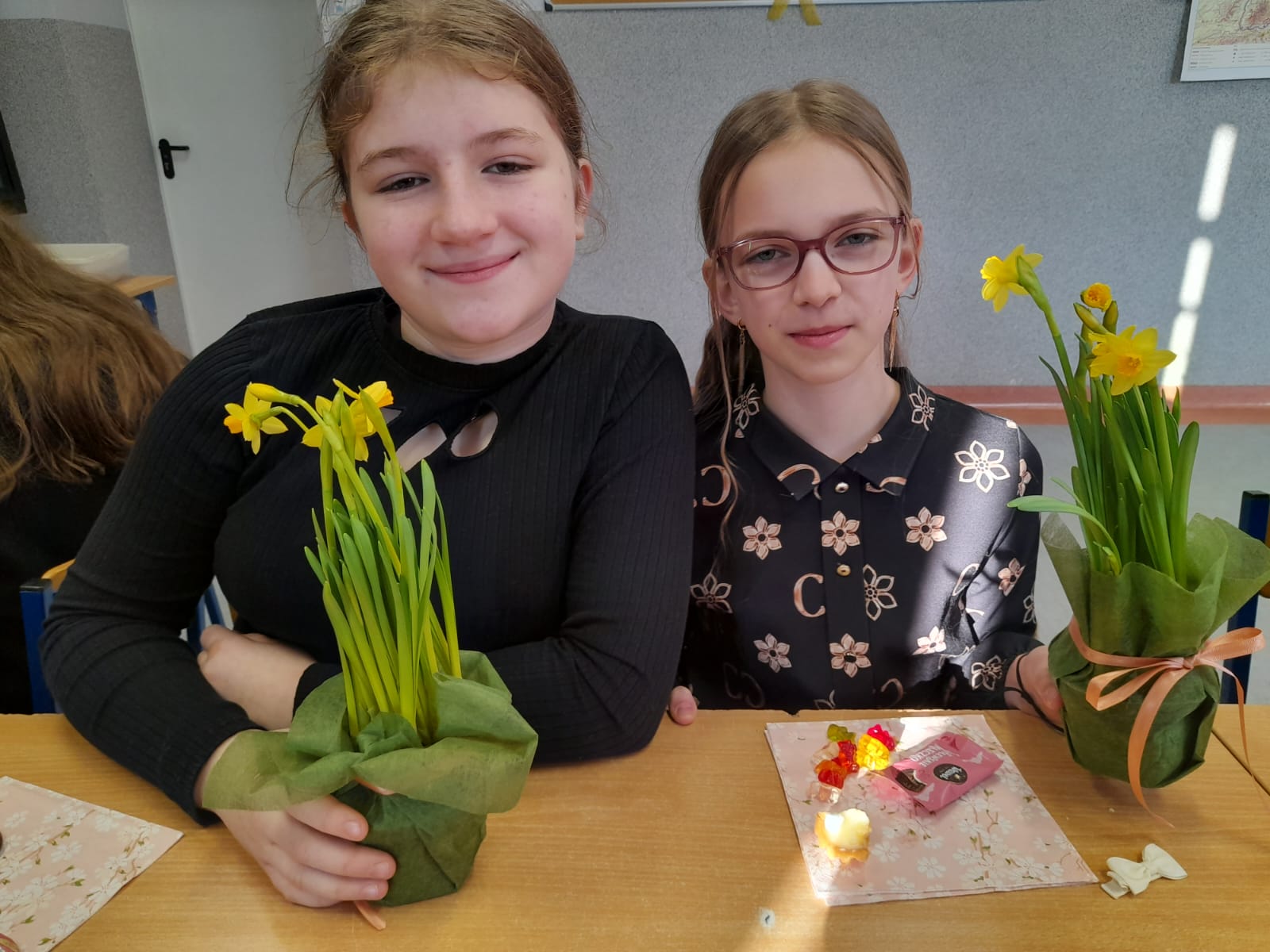 W Dniu Kobiet chłopcy z klasy 5 przygotowali piękną niespodziankę dla koleżanek. Przed pierwszą lekcją zrobili gazetkę w klasie, ustawili stoliki tak, aby wszyscy siedzieli przy jednym dużym stole, ułożyli na stolikach piękne kwiaty i słodkości, a później robili dla chętnych watę cukrową w różnych smakach.