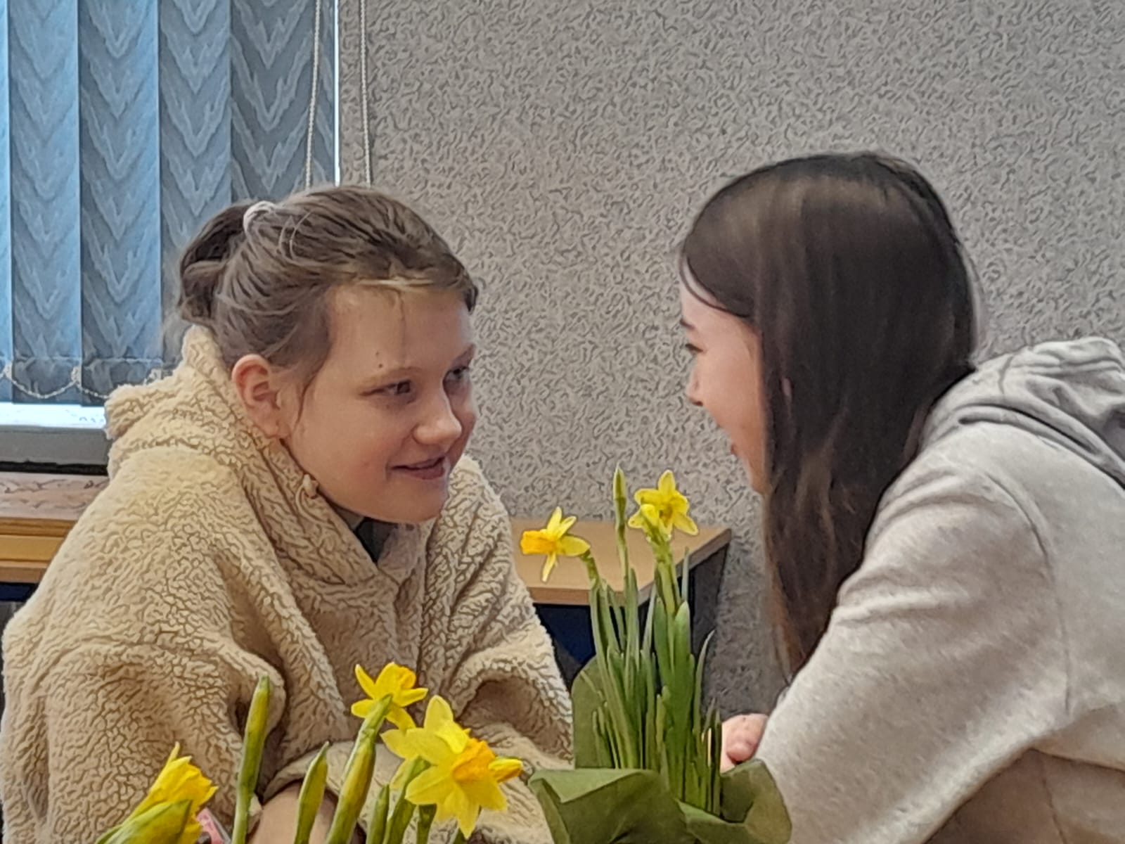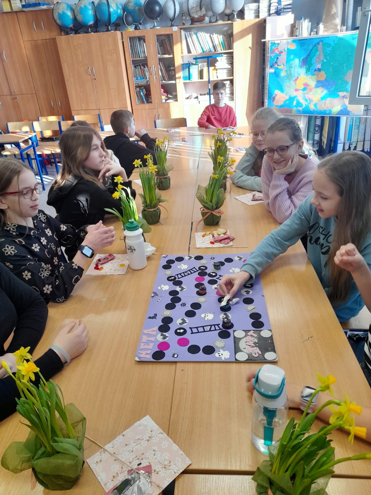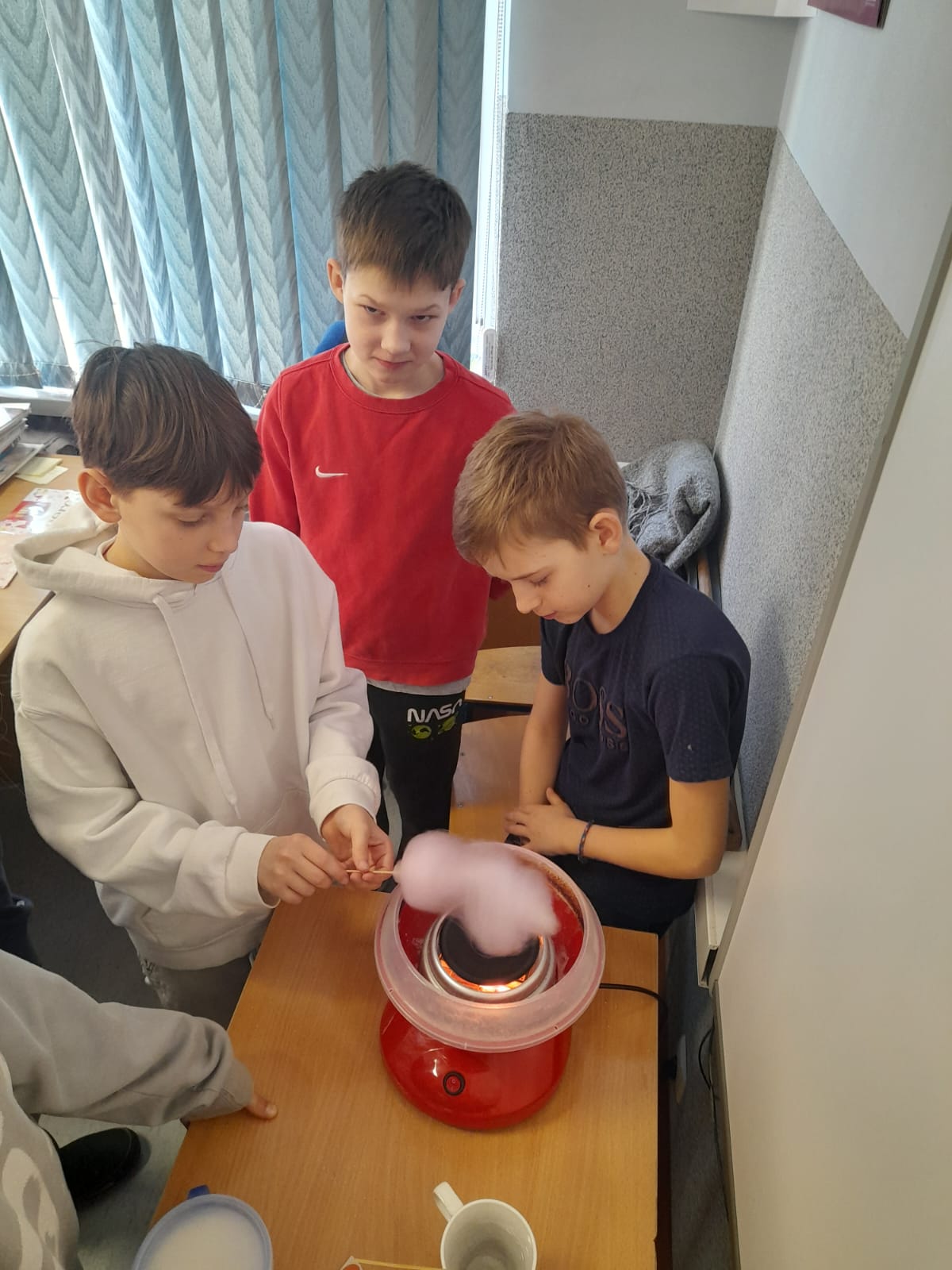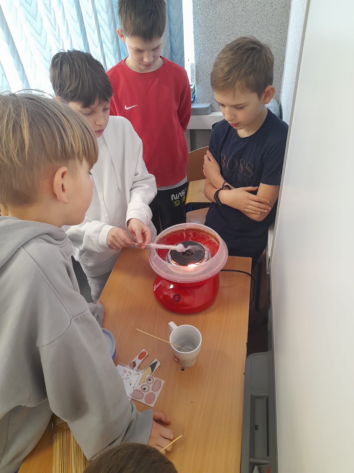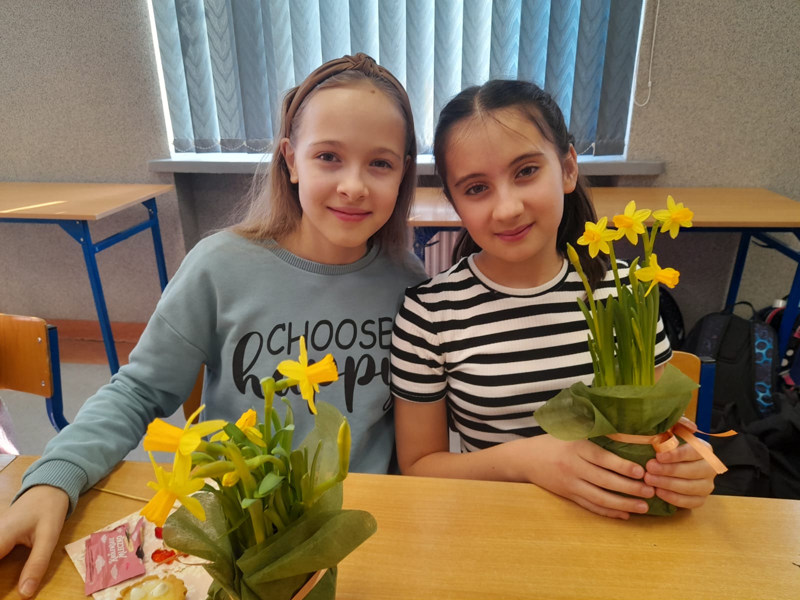 W Dniu Kobiet chłopcy z klasy 5 przygotowali piękną niespodziankę dla koleżanek. Przed pierwszą lekcją zrobili gazetkę w klasie, ustawili stoliki tak, aby wszyscy siedzieli przy jednym dużym stole, ułożyli na stolikach piękne kwiaty i słodkości, a później robili dla chętnych watę cukrową w różnych smakach.