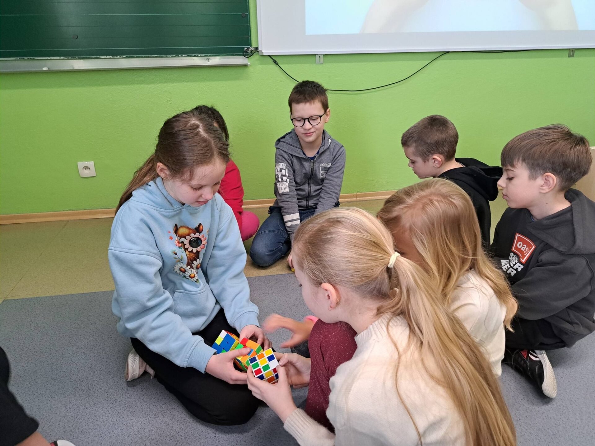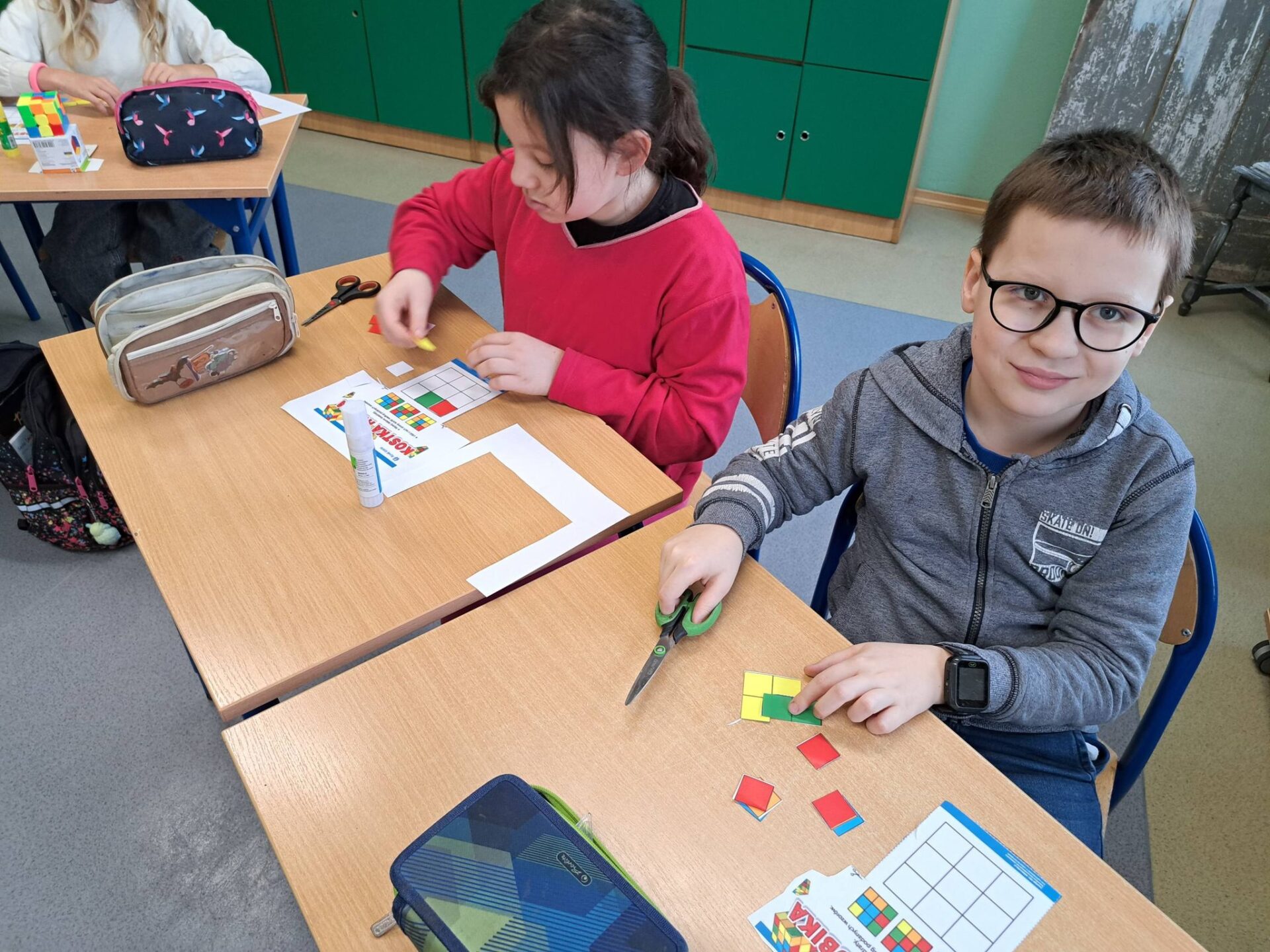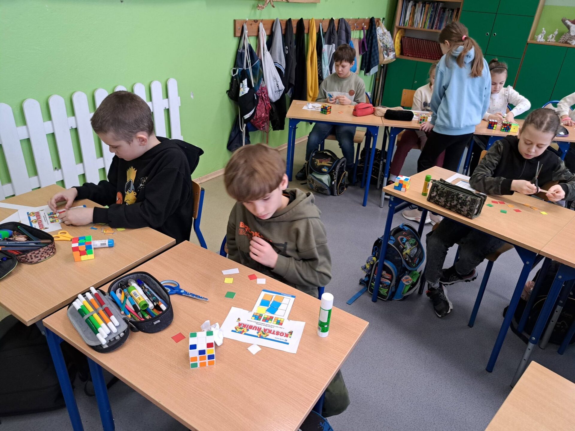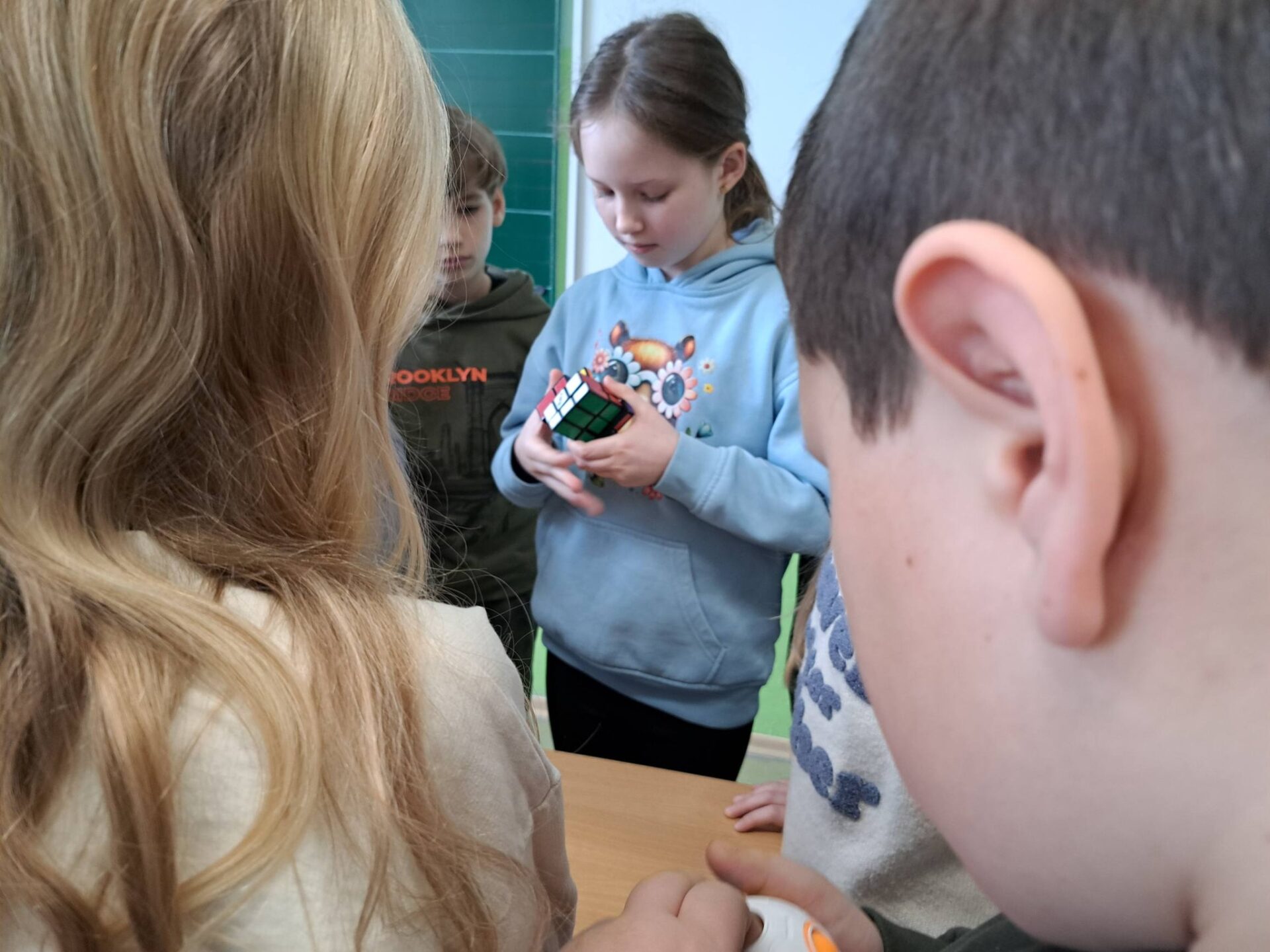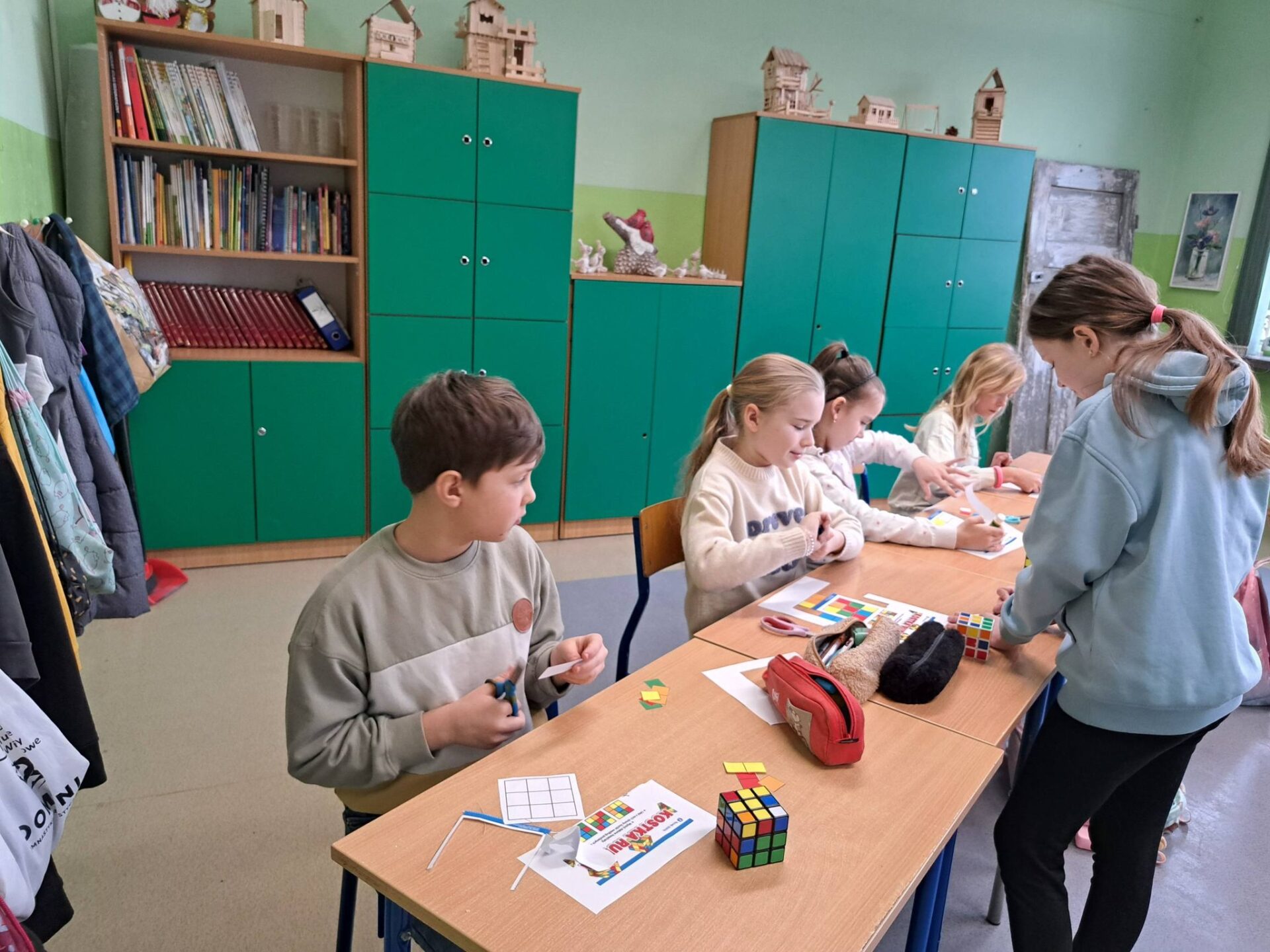 Kolejnym etapem była wyjątkowa historyjka o kotku i myszce. Dzięki niej każdy uczeń mógł krok po kroku spróbować samodzielnie ułożyć jedną ściankę swojej kostki. Okazało się, że z odpowiednią instrukcją i odrobiną cierpliwości – wszystko jest możliwe!