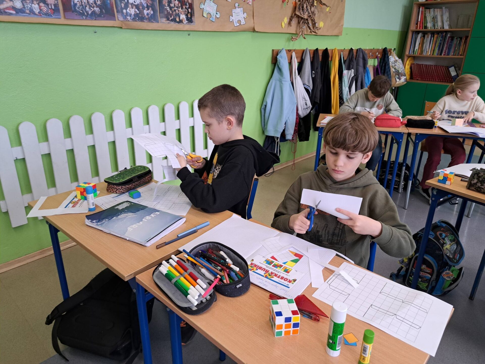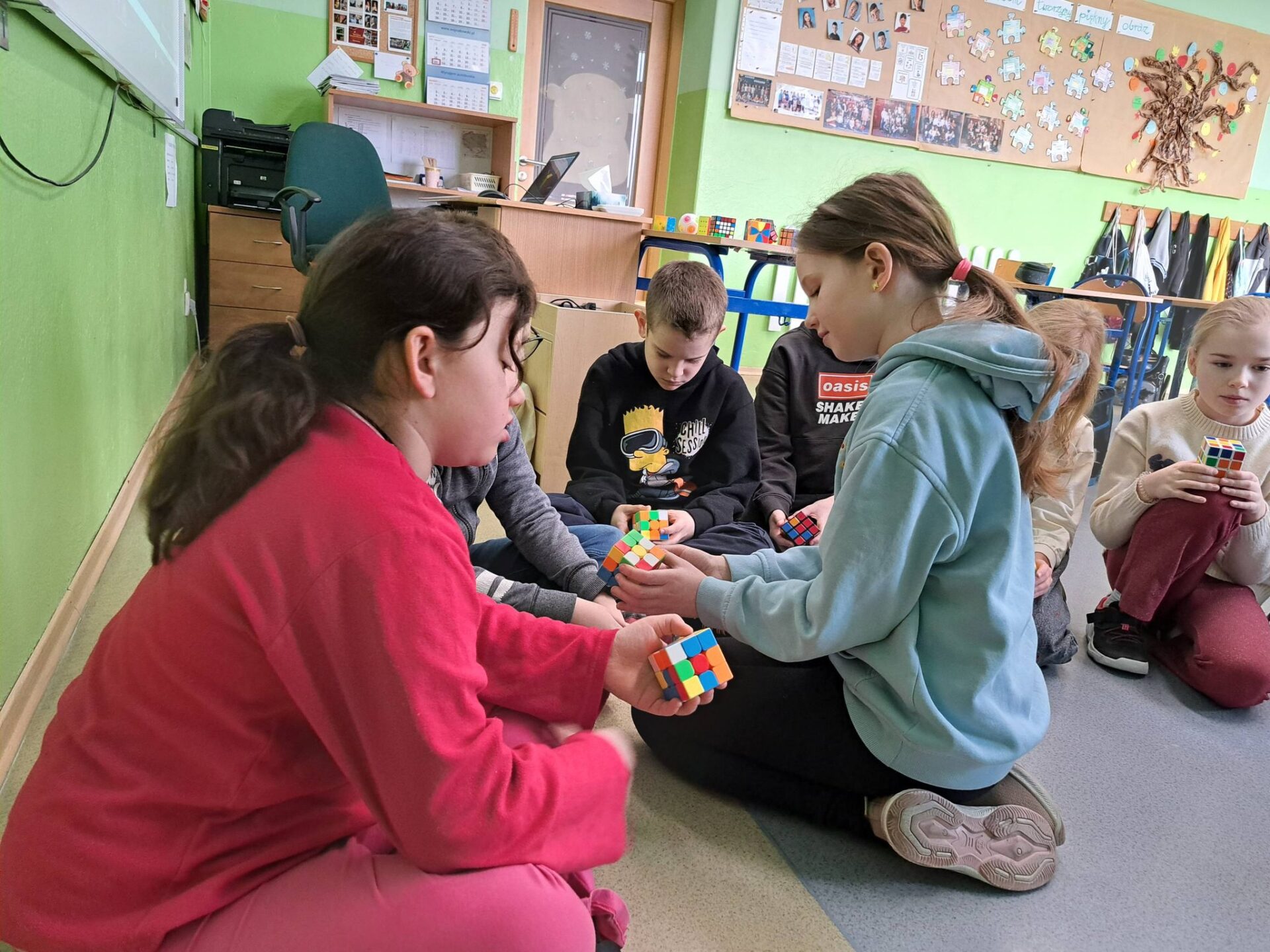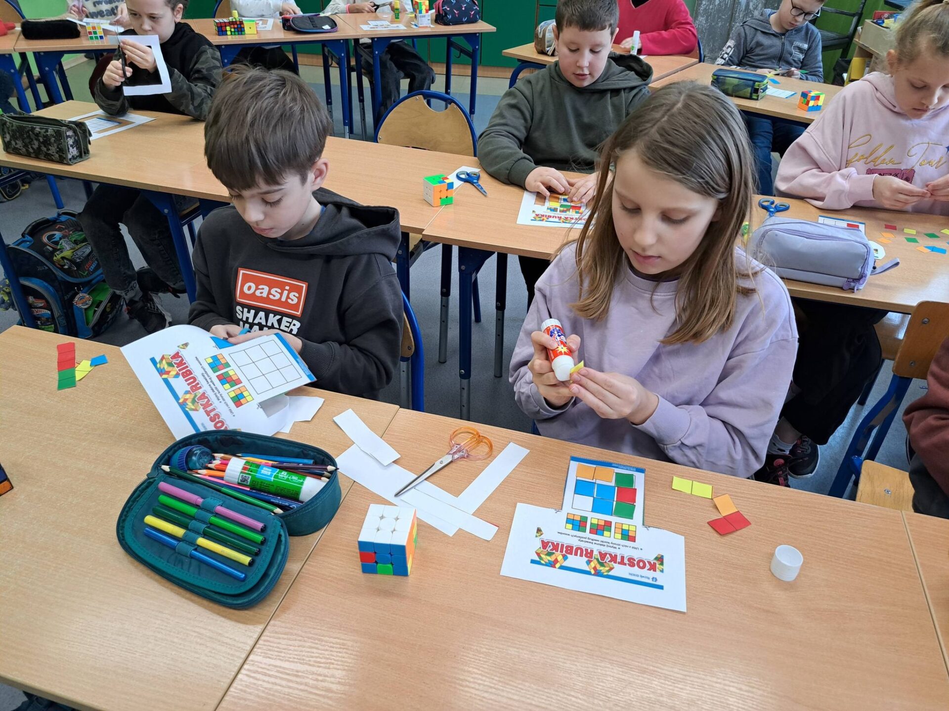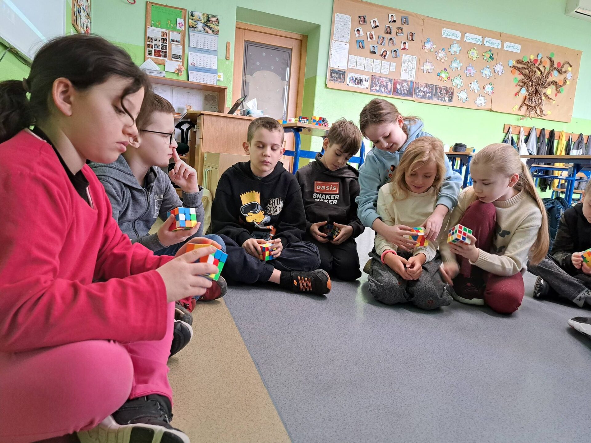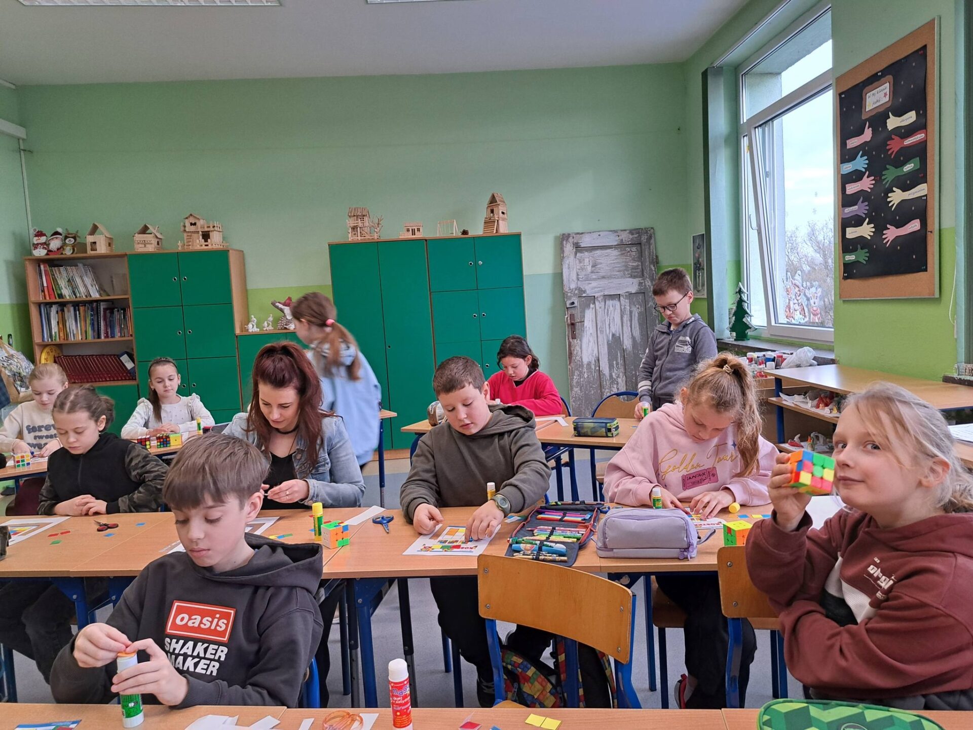 Kolejnym etapem była wyjątkowa historyjka o kotku i myszce. Dzięki niej każdy uczeń mógł krok po kroku spróbować samodzielnie ułożyć jedną ściankę swojej kostki. Okazało się, że z odpowiednią instrukcją i odrobiną cierpliwości – wszystko jest możliwe!