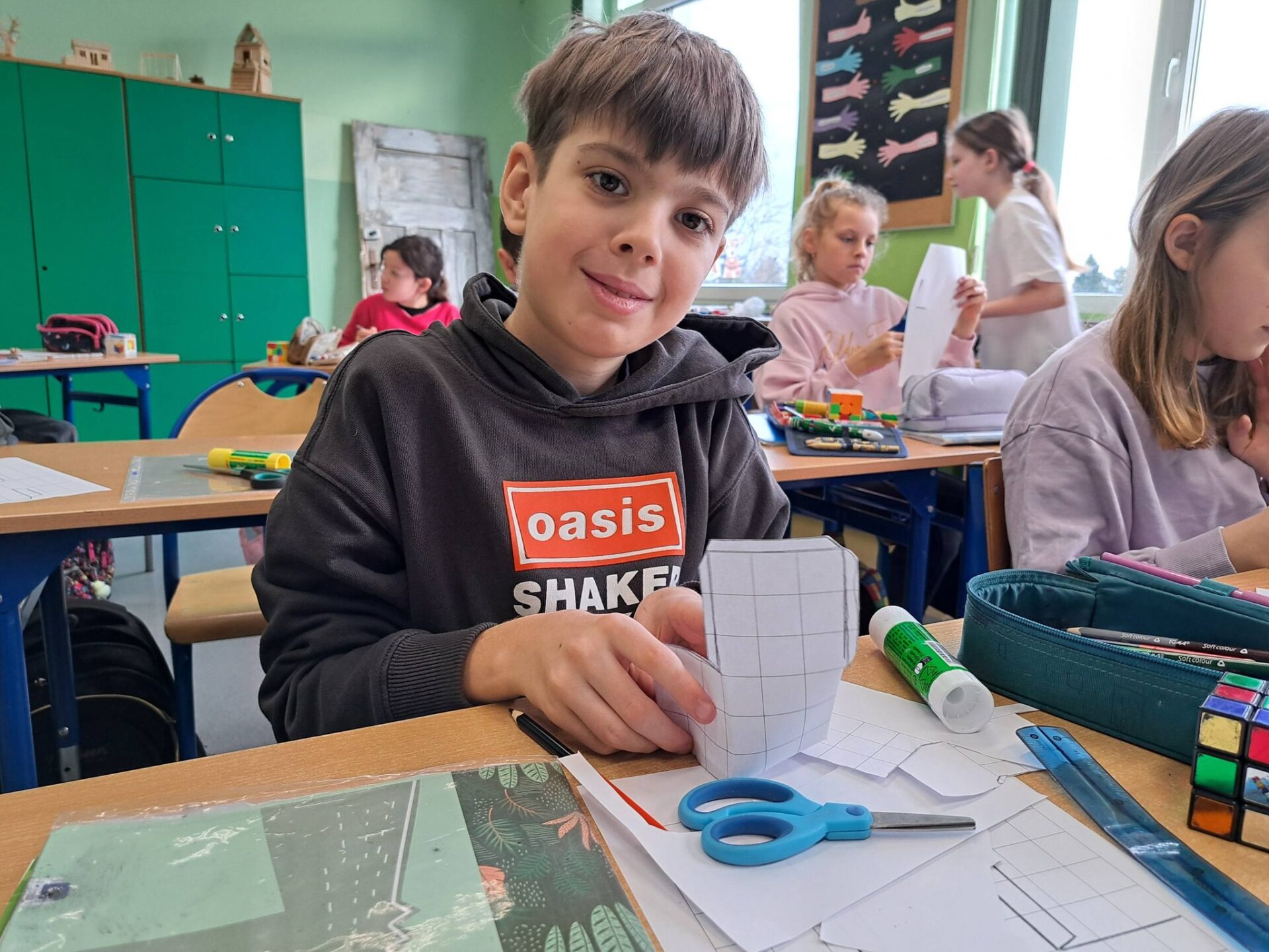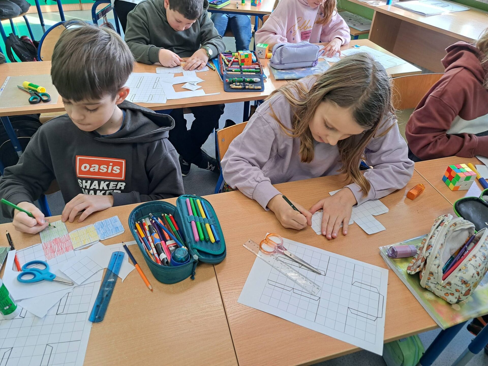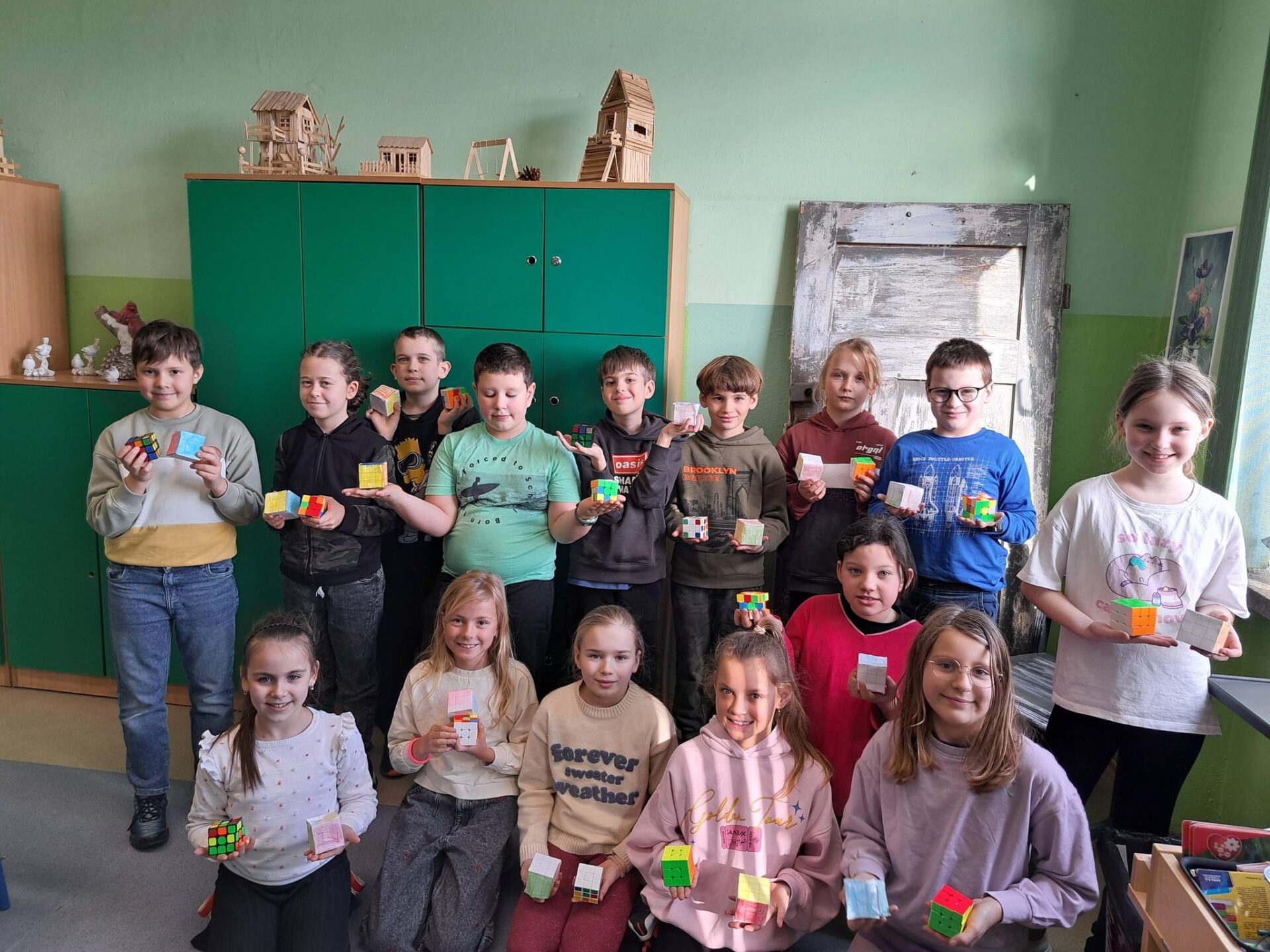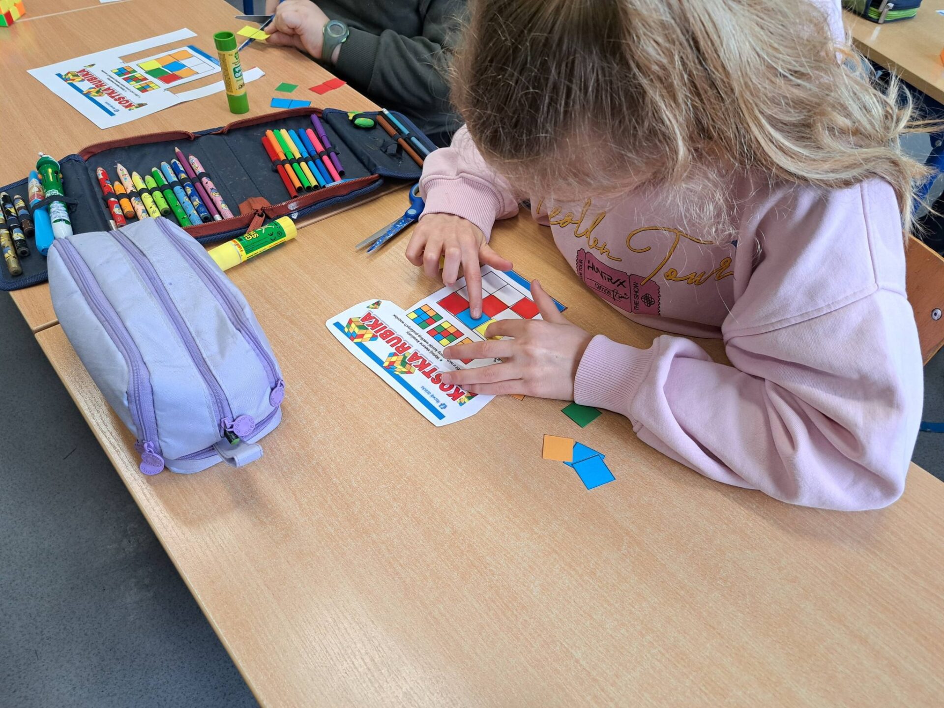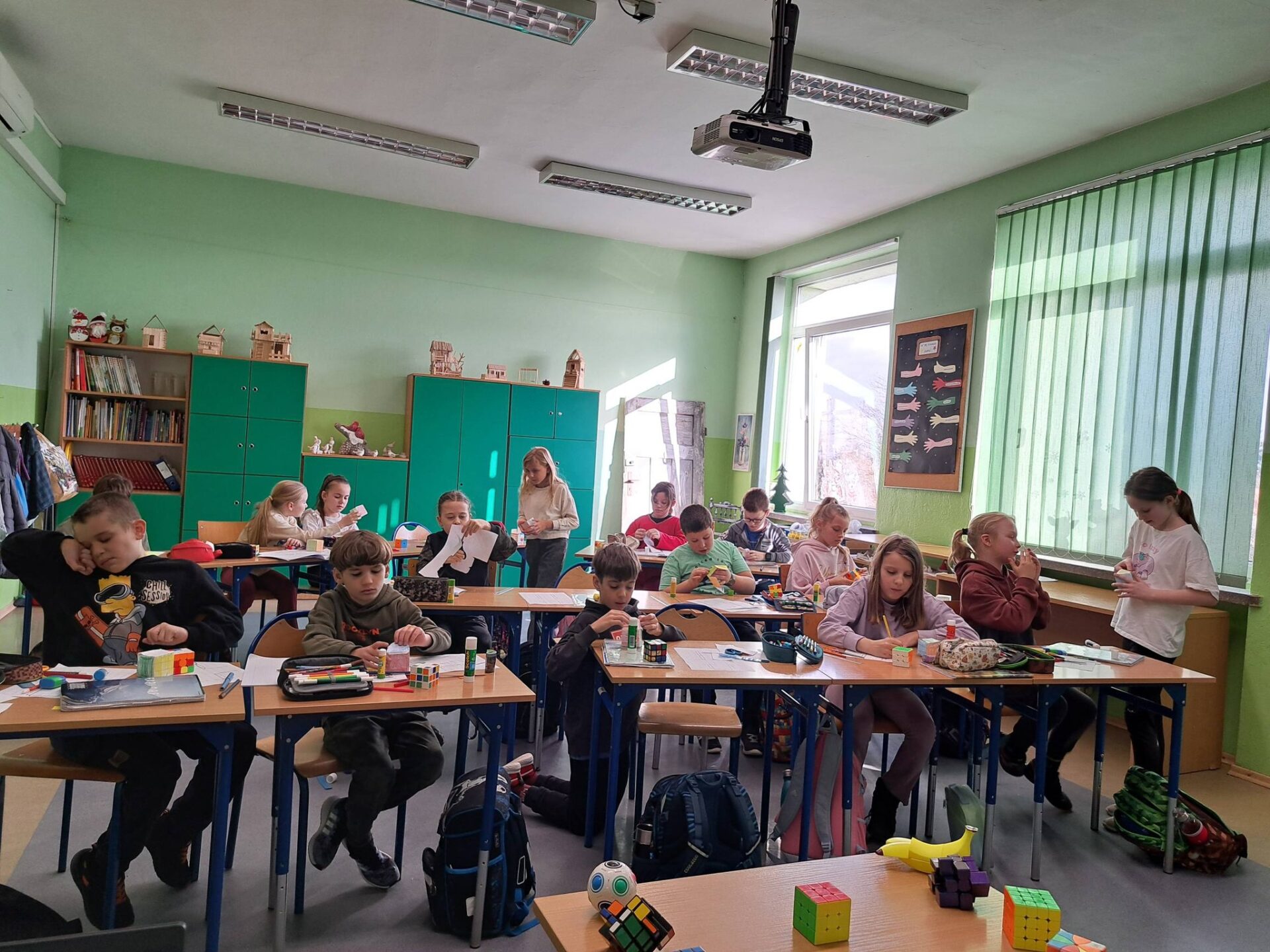 Kolejnym etapem była wyjątkowa historyjka o kotku i myszce. Dzięki niej każdy uczeń mógł krok po kroku spróbować samodzielnie ułożyć jedną ściankę swojej kostki. Okazało się, że z odpowiednią instrukcją i odrobiną cierpliwości – wszystko jest możliwe!