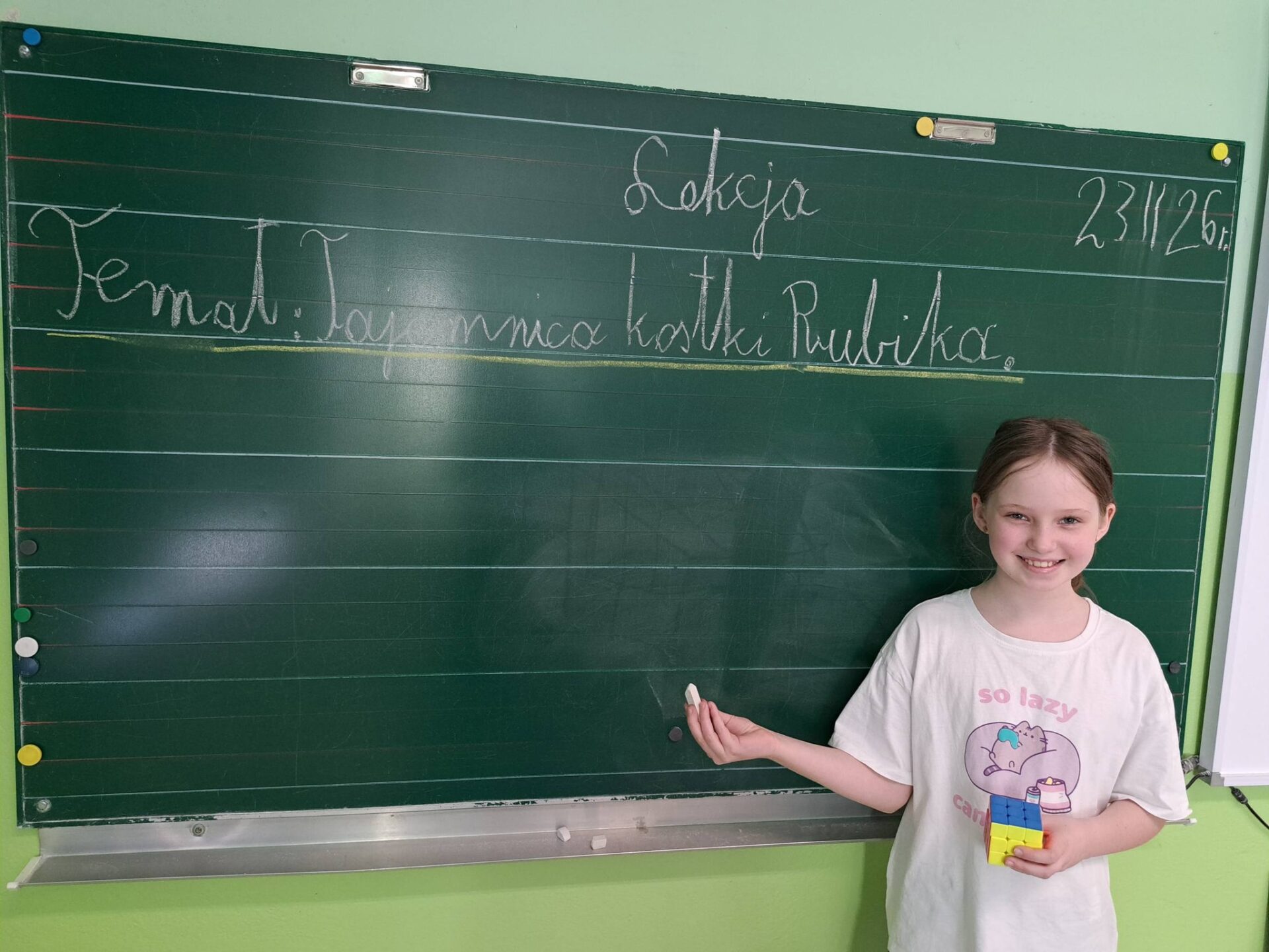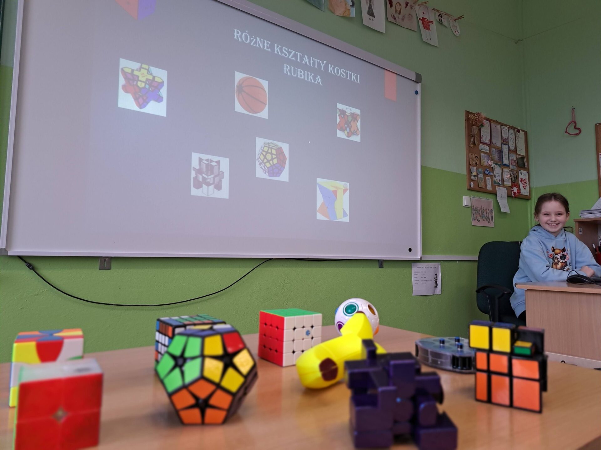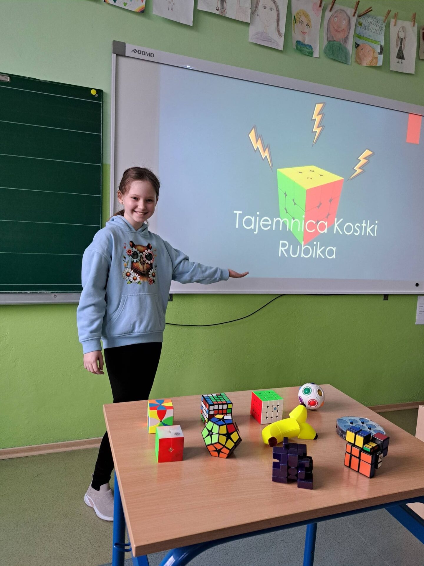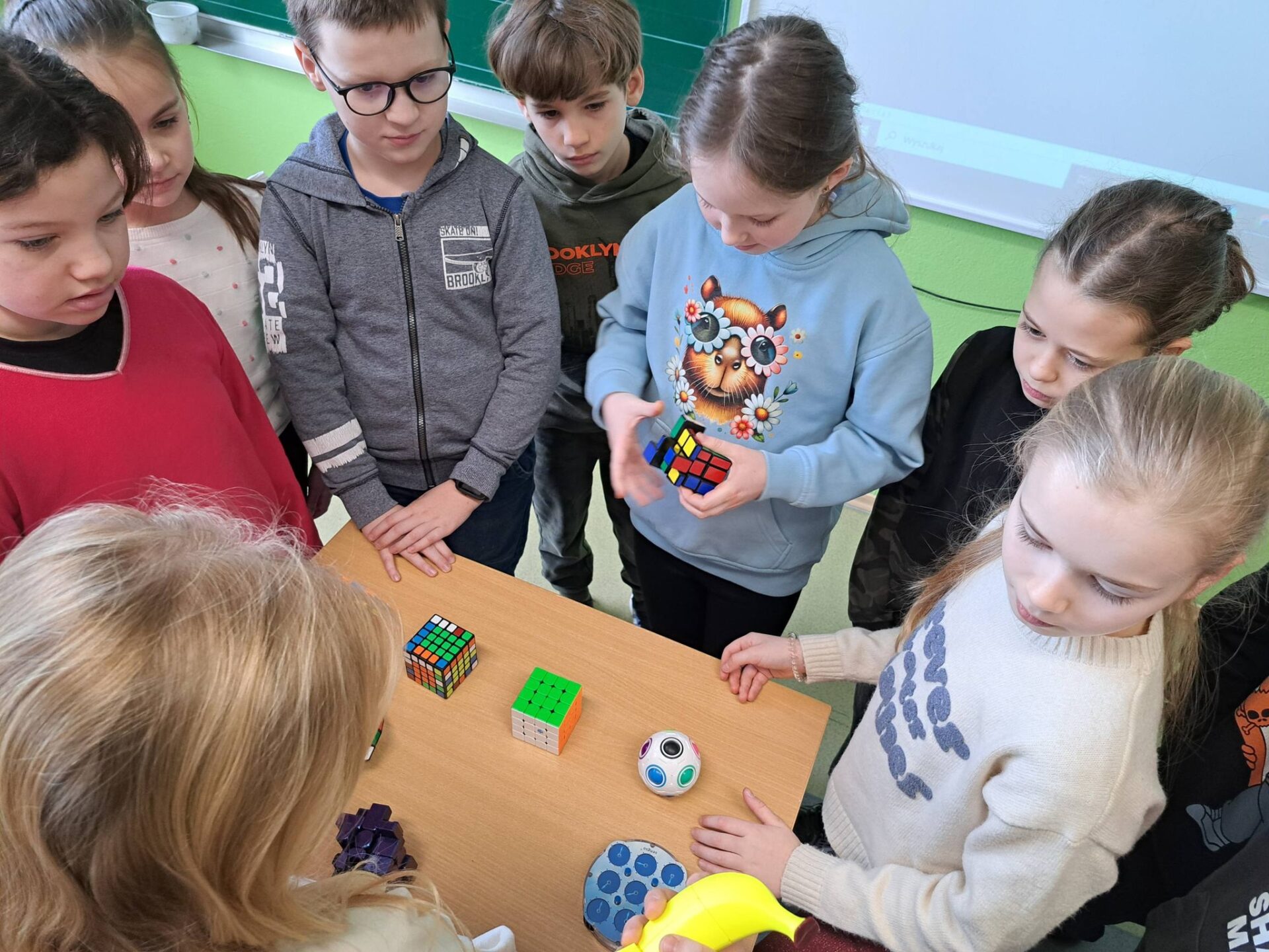 Na początku Madzia zaprezentowała przygotowaną przez siebie prezentację, w której wprowadziła nas w temat. Opowiedziała o historii powstania kostki oraz jej twórcy – Ernő Rubik. Dowiedzieliśmy się, że początkowo była ona pomocą naukową, a z czasem stała się jedną z najpopularniejszych łamigłówek na świecie! Nie zabrakło także ciekawostek i informacji o rekordach w jej układaniu na czas – uczniowie z ogromnym zainteresowaniem słuchali o najszybszych „speedcuberach”.