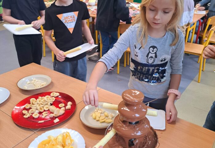 Uczniowie klasy 1a podczas dzisiejszych zajęć dowiedzieli się jak powstaje czekolada. Mieli możliwość powąchania i spróbowania ziaren kakaowca. Samodzielnie kroili gruszki i jabłka, obierali pomarańcze, z których wykonali koreczki. Degustowali też suszone truskawki i maliny. Komponowali tabliczki czekolady według własnego pomysłu. Na koniec wspólnie tańczyli do piosenki „Czekolada”. Działo się!