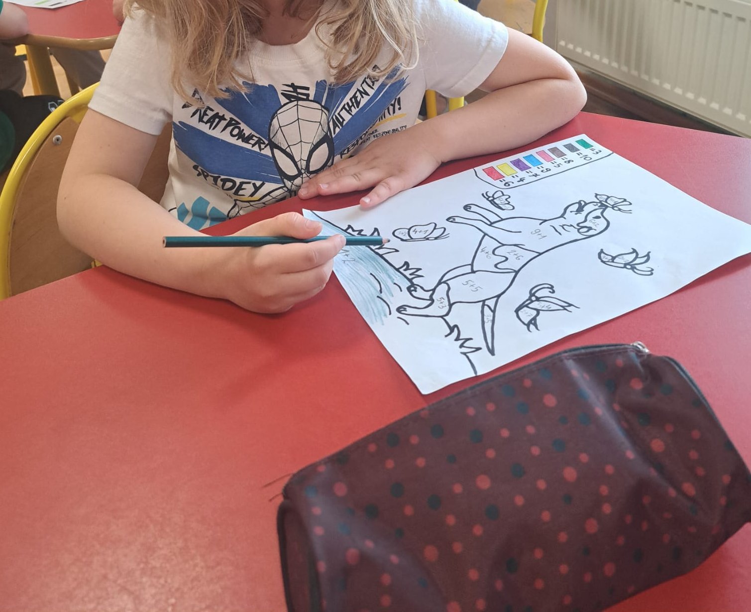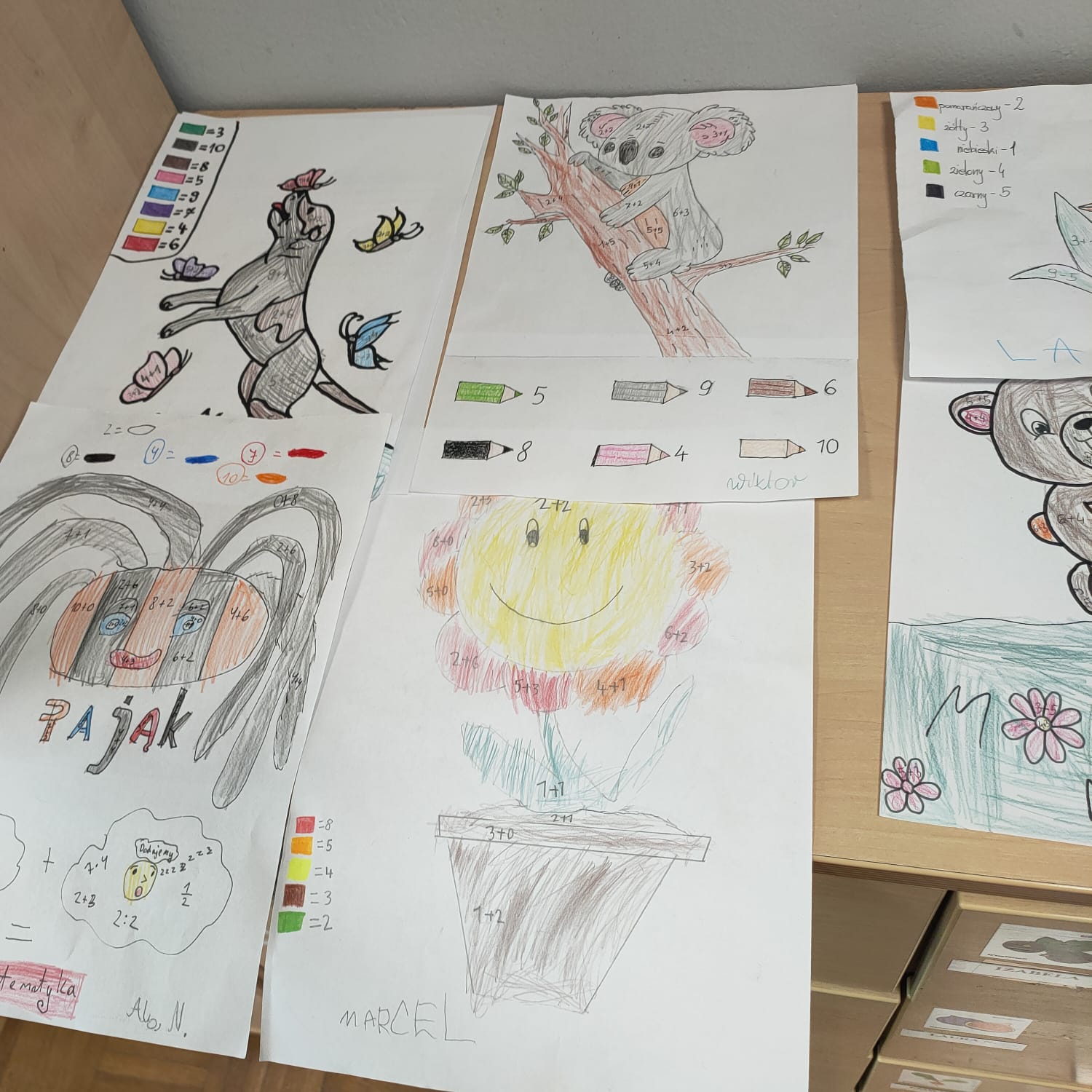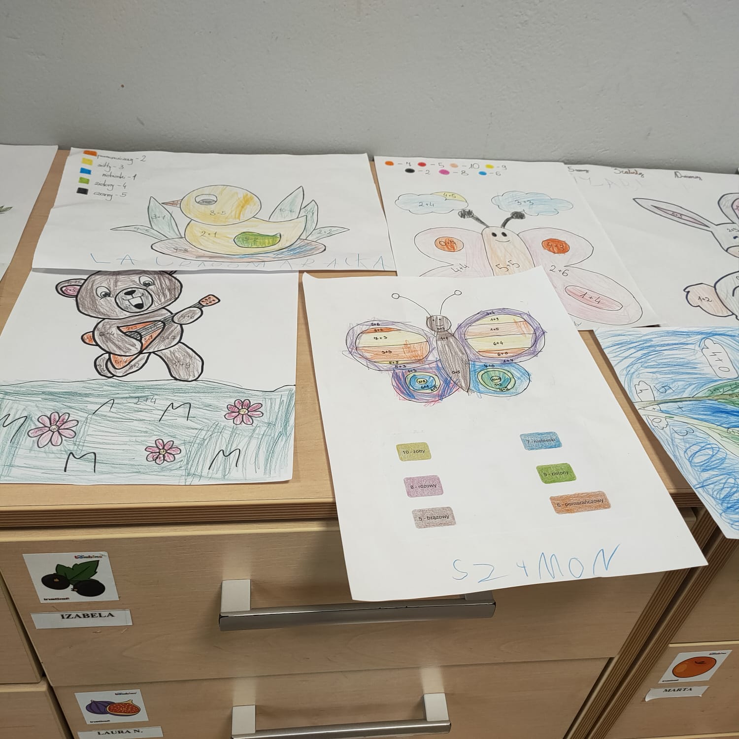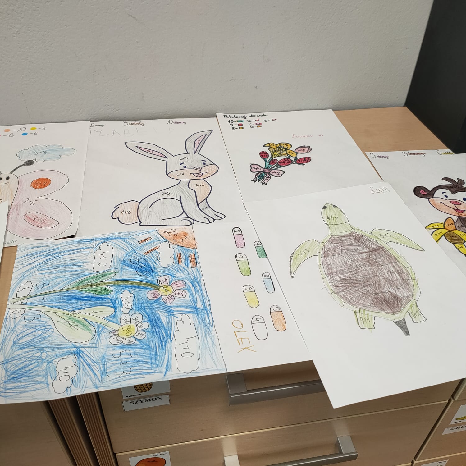 wykonali podczas zajęć. Dzieci mogły wybrać kolorowankę z motywem ulubionego pupila. Każdy ochoczo usiadł do stolika, aby dokonać działań (dodawanie w zakresie 10).
