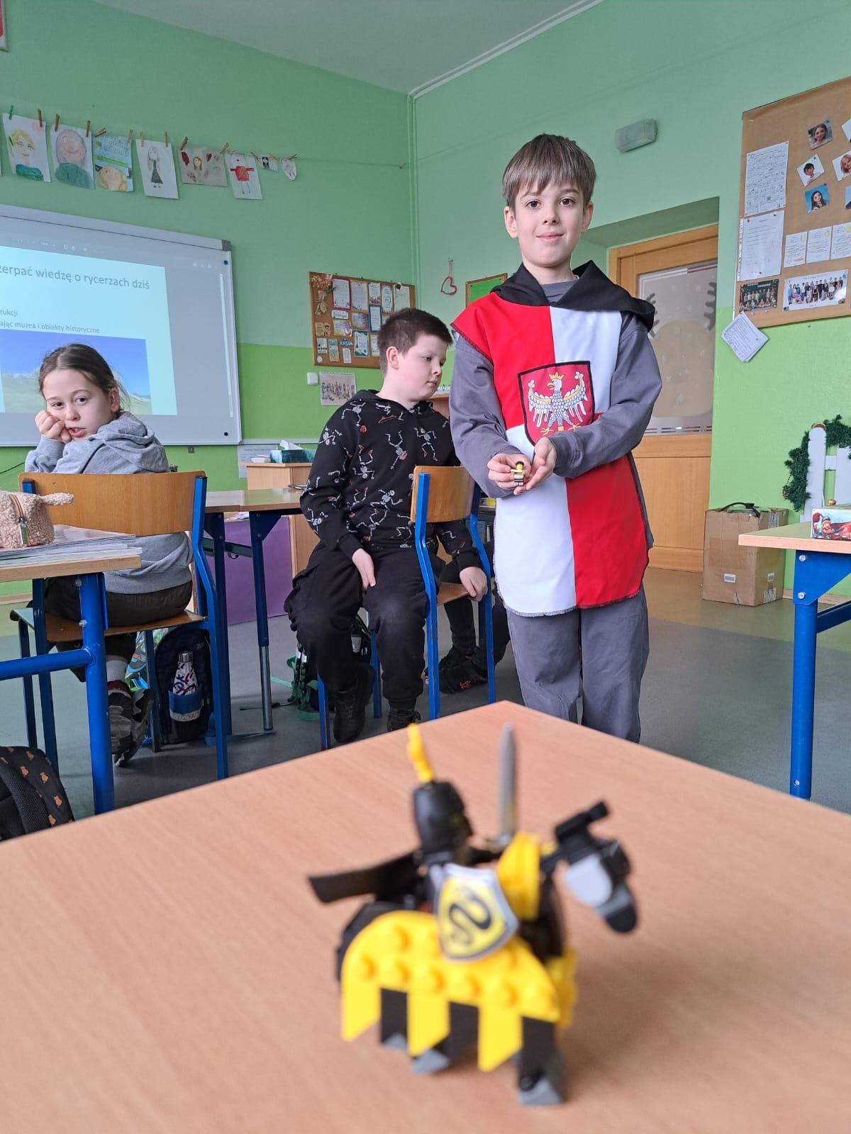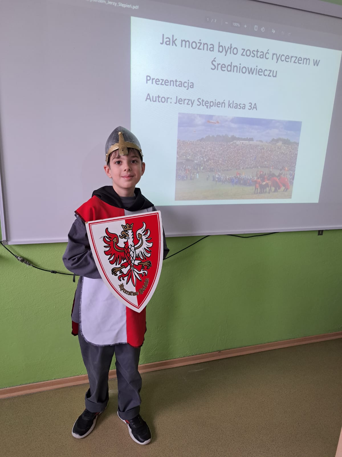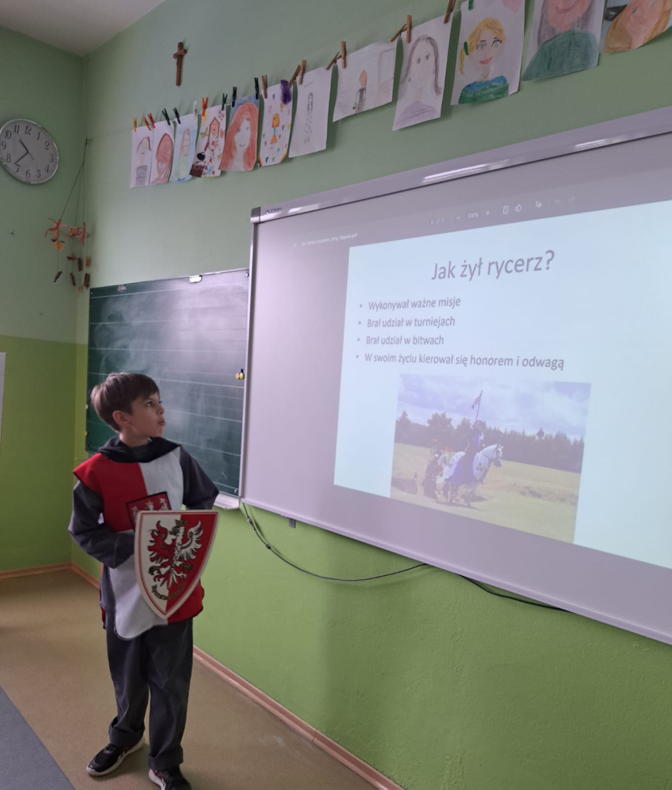 Uczeń w ciekawy i przystępny sposób opowiadał o tym, jak wyglądało życie rycerza od najmłodszych lat, jaką drogę musiał przejść, aby zostać pasowanym na rycerza oraz jakie obowiązki i wyzwania wiązały się z tym zawodem. Nie zabrakło również ciekawostek z życia codziennego w średniowieczu oraz informacji na temat rycerskiego uzbrojenia i umundurowania.