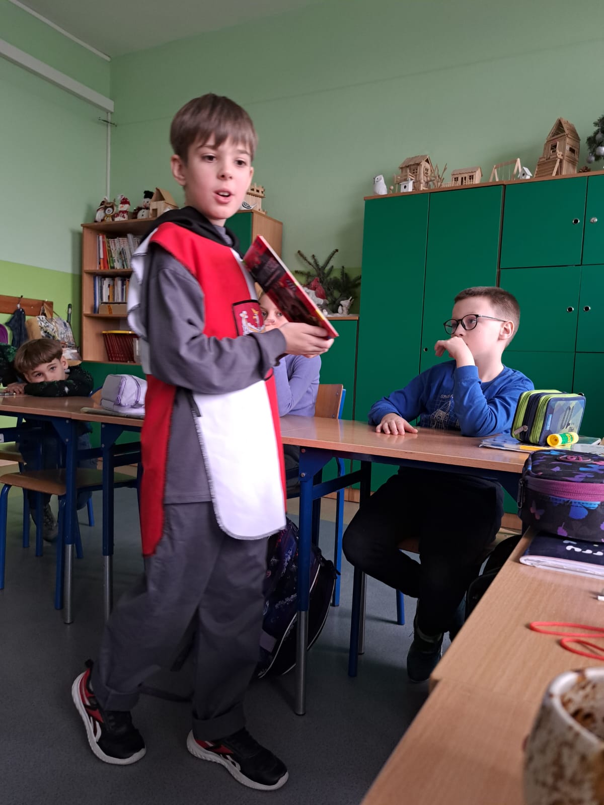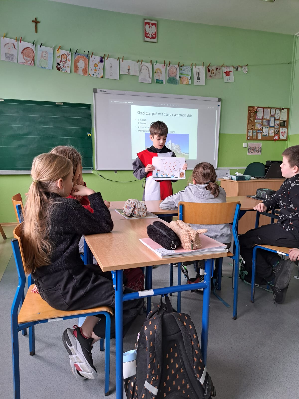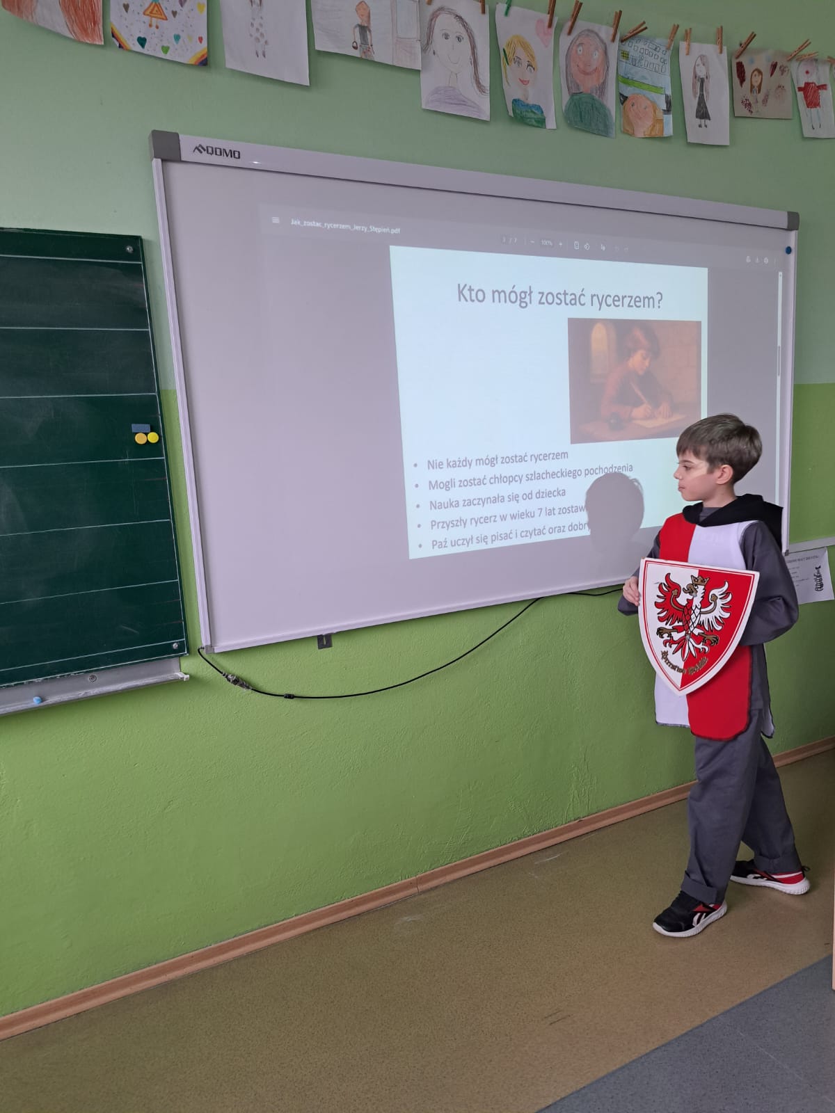 Uczeń w ciekawy i przystępny sposób opowiadał o tym, jak wyglądało życie rycerza od najmłodszych lat, jaką drogę musiał przejść, aby zostać pasowanym na rycerza oraz jakie obowiązki i wyzwania wiązały się z tym zawodem. Nie zabrakło również ciekawostek z życia codziennego w średniowieczu oraz informacji na temat rycerskiego uzbrojenia i umundurowania.