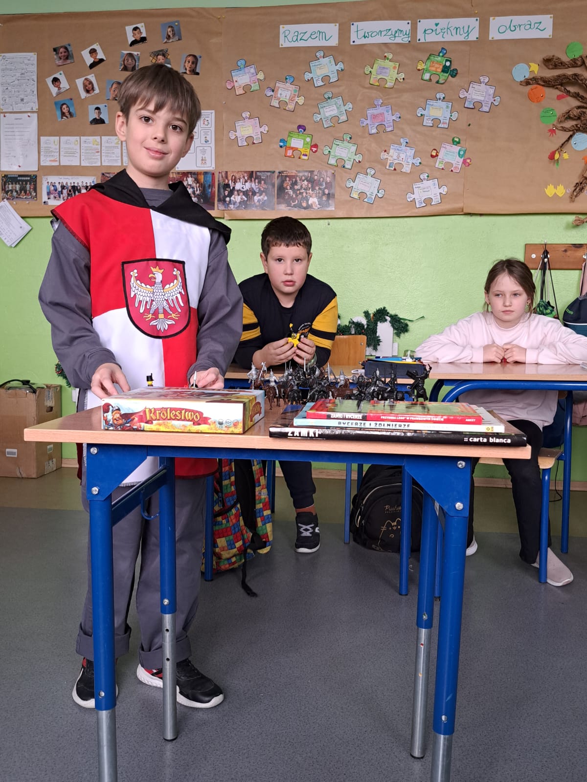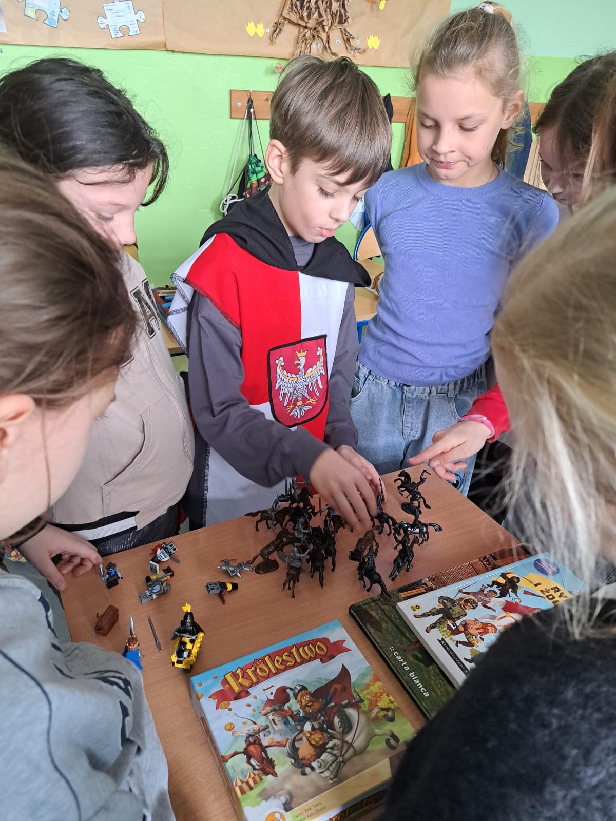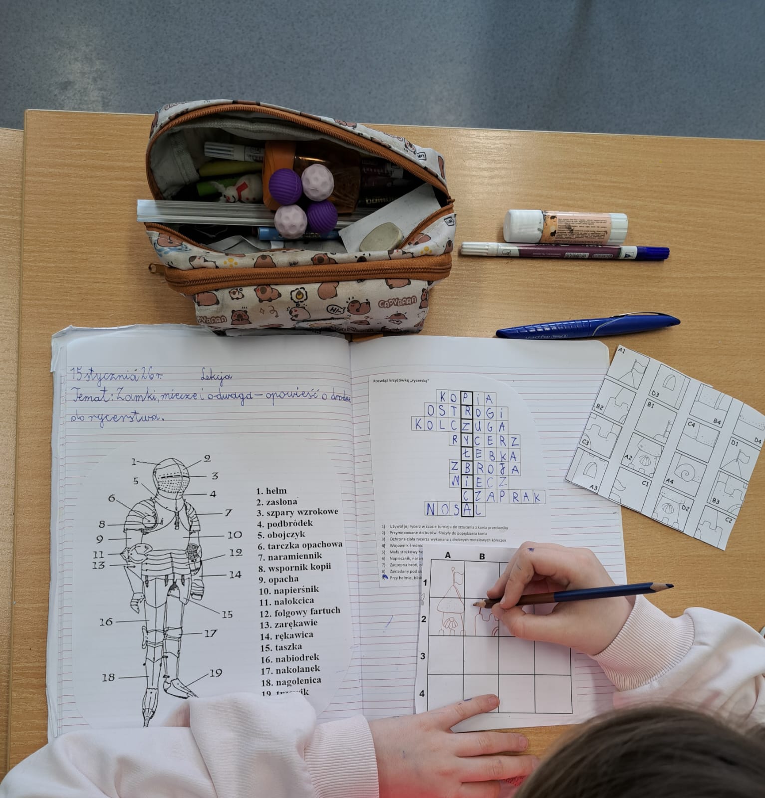 Zajęcia miały też charakter interaktywny. Uczniowie rozwiązywali krzyżówkę z hasłami dotyczącymi życia rycerskiego, wykonywali zadanie z kodowania – obrazek zamku, a także poznawali realia walk rycerskich dzięki przygotowanym figurkom rycerzy, które posłużyły do opowieści o bitwach i życiu na polu walki.