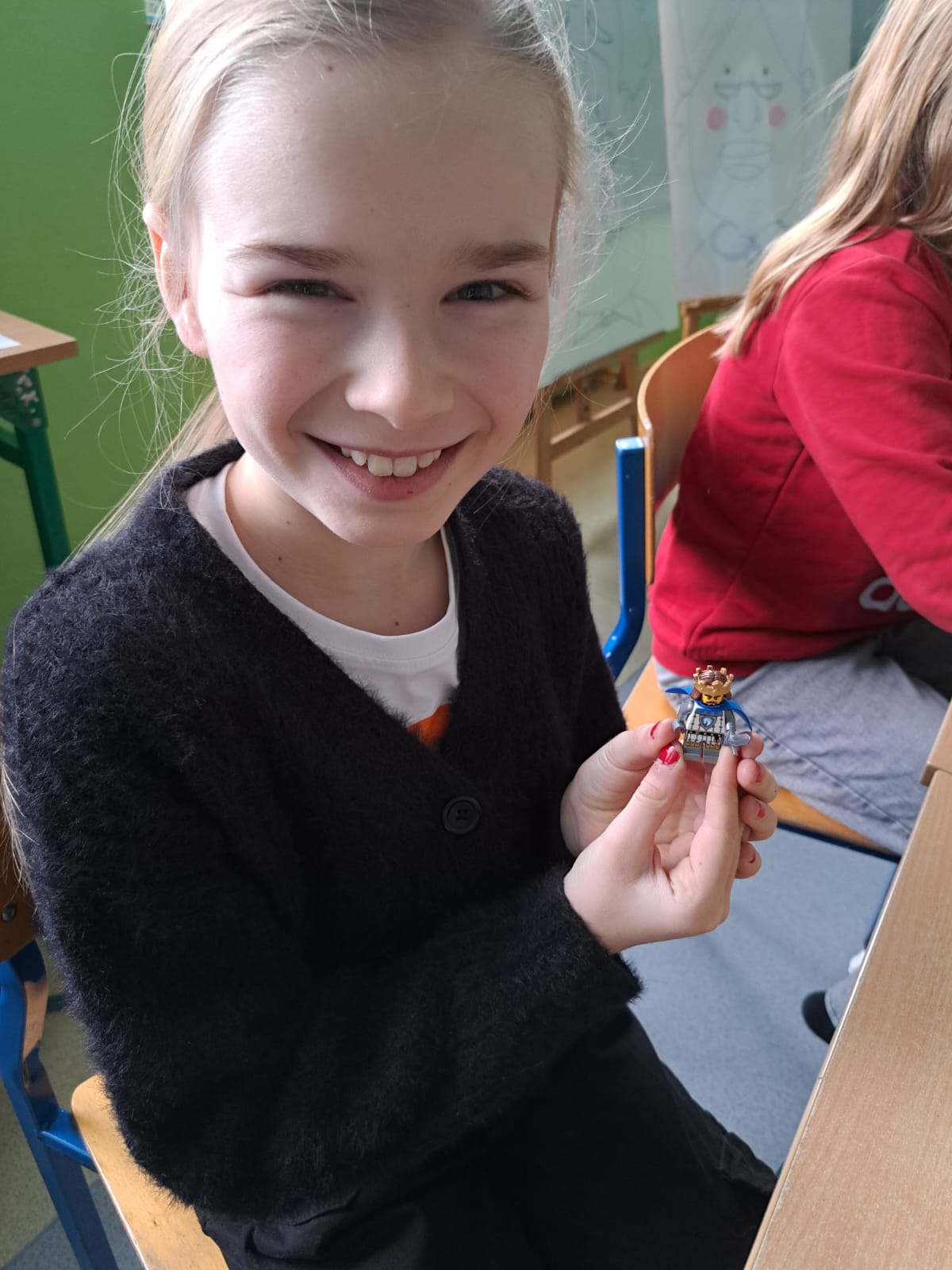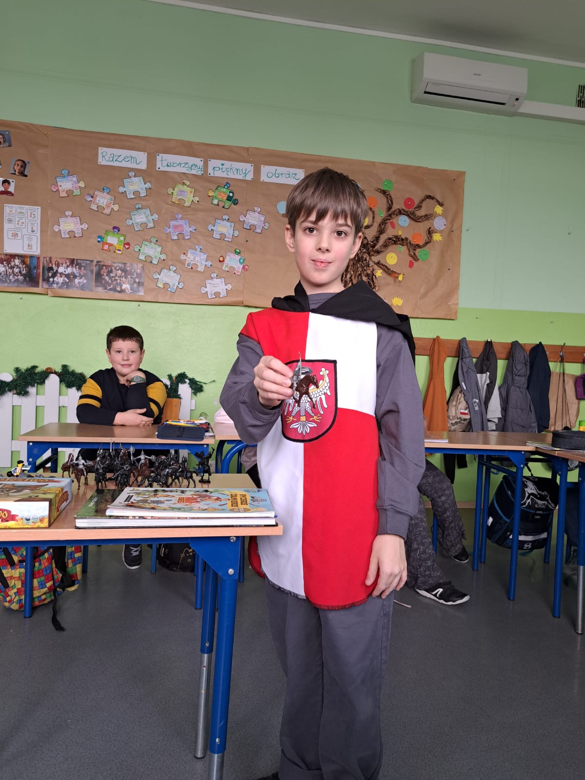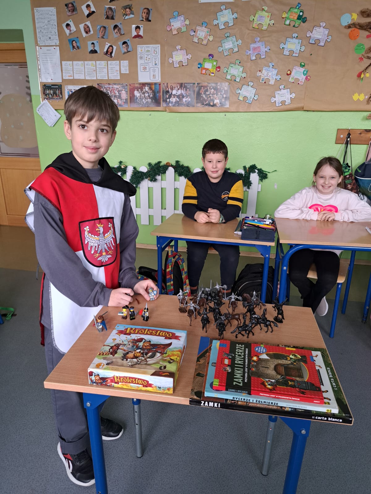 Zajęcia miały też charakter interaktywny. Uczniowie rozwiązywali krzyżówkę z hasłami dotyczącymi życia rycerskiego, wykonywali zadanie z kodowania – obrazek zamku, a także poznawali realia walk rycerskich dzięki przygotowanym figurkom rycerzy, które posłużyły do opowieści o bitwach i życiu na polu walki.
